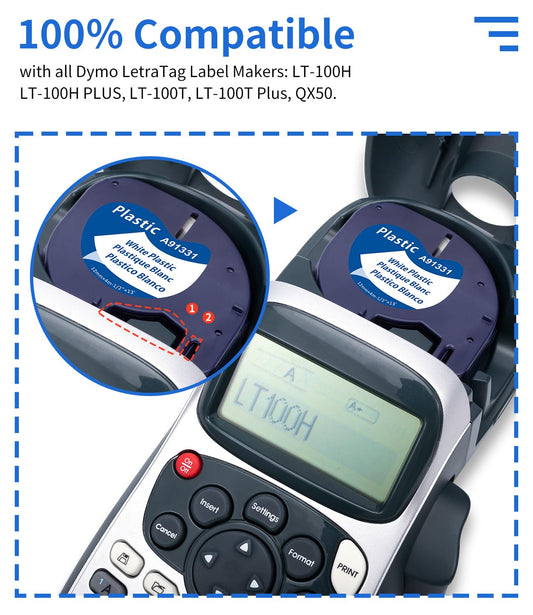 Compatible Dymo LetraTag Refill Tape 91331 (S0721610) Plastic Labels Tape, Black on White,12mm x 4m (1/2Inch x 13Feet), Replace for Dymo LetraTag Plus LT100H LT100T QX50 Label Makers, 5-Pack