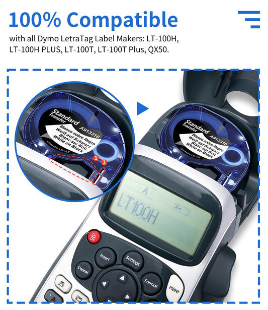Compatible with DYMO LetraTag Refills White Paper 91330 10697 Label Tape, 1/2'' x 13' 12mm x 4m Black on White Label Maker Tape for Letra Tag LT-100H Plus Printer, 5-Pack
