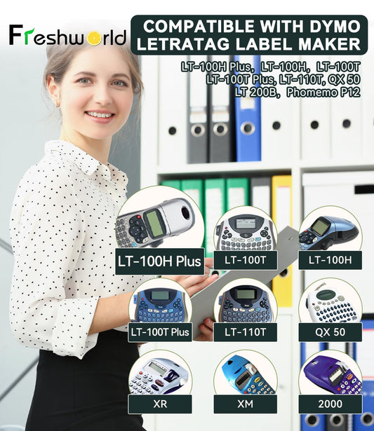 Freshworld DYMO LetraTag Refills Tape, Replaced 91331 Plastic Labels Tape, Black on White,1/2Inch x 13Feet(12mm x 4m), for DYMO LetraTag Plus LT100H LT100T QX50 Label Makers, 10-Pack