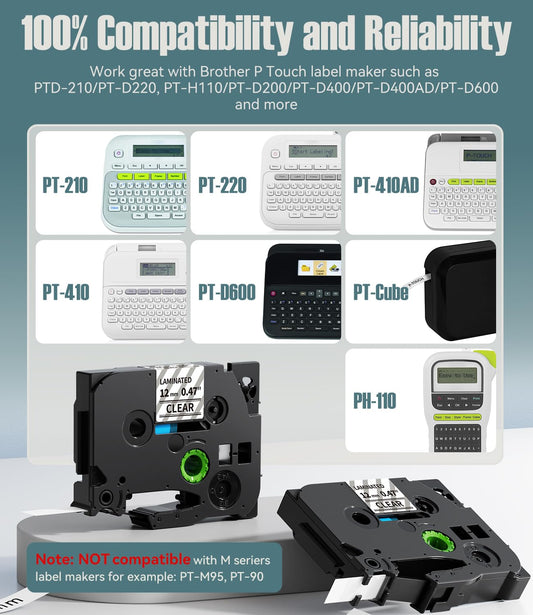Label Maker Tape Clear TZe-131 Compatible for Brother P-Touch Label Tape 12mm 0.47 Inch TZ-131 Laminated Black on Clear Tze-131 for PT D210 H110 D220 D410 D6001280, 1/2 Inch x 26.2 ft, 5-Pack